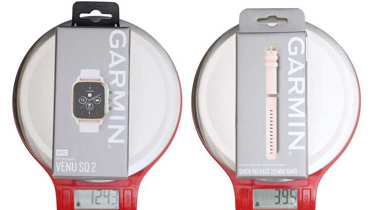 Garmin Venu Sq 2 — Music Edition 包裝重量約 124.3g。Garmin Quick Release 20mm Band 包裝重量約 39.5g。