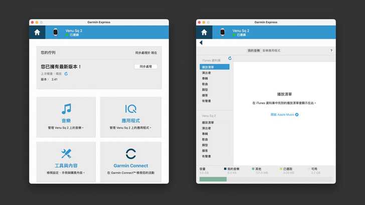 總的來說,不管你想透過手機連線到 Venu Sq 2,還是透過電腦管理,又或是專注於使用手錶本身搭配雲端使用,Garmin 都有對應的工具可以滿足消費者的使用習慣。不過 Garmin Express 感覺與其他應用程式和雲端服務的操作有點分離感。我個人原本期待能夠在 Apple Silicon 的 Mac 上運行 iPhone、iPad 版的 Connect IQ 和 Garmin Connect。目前雖然還無法支援,但若未來軟體更新後能銜接上 Mac,基本上就可以取代 Garmin Express 的功能,對於 MacBook 重度使用者來說體驗就更完美了。