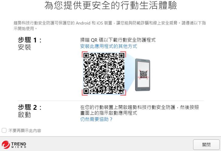 當你把”PC-cillin Pro雲端版+安全VPN”的程式下載安裝好了之後,會跳出QR Code讓手機也可以下載安裝程式!