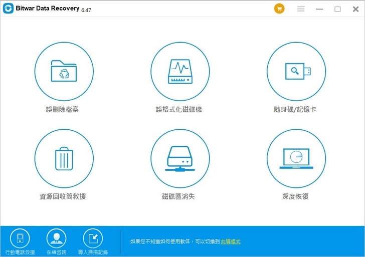在Bitwar  Data  Recovery程式的嚮導模式下,您可以看到6種不同的救援模式,並且每種都著重於不同的檔案丟失情況。當您想從USB隨身碟救援丟失/刪除的檔案時,請選擇"USB /存儲卡救援"。您也可以選擇"格式化硬碟救援"當您要救援格式化USB隨身碟檔案。