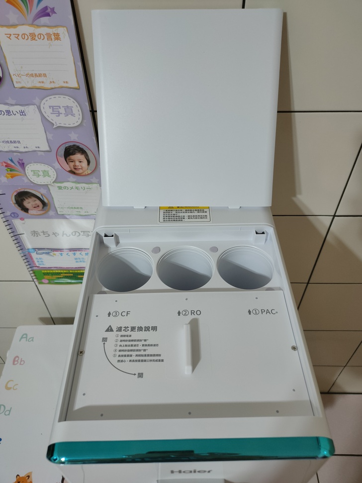 ▲上方隔板輕按即可開啓,為3道濾芯安裝處,同樣標識清楚,跟著數字或濾芯功能安裝即可。