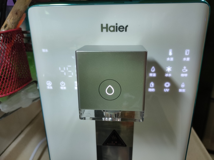 ▲正面功能鍵被大大的出水口擋了不少,讓我們分開仔細看一下操作介面,除了有顏色區分外,亦有溫度提示,燈號閃爍也代表不同功能,待機時,會顯示當下的水質檢測數值(TDS:數值40以下即表可飲用),讓你用水前即可知品質如何。