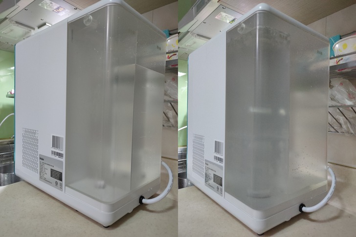 ▲原水水箱(6L)與餘水水箱(2.5L)搭配上大致沒問題,雖沒有完全裝滿6L,但也在5.5L左右,產生餘水大約近滿水位,看來確屬低餘水的RO淨水設備。