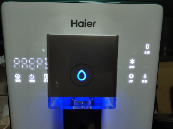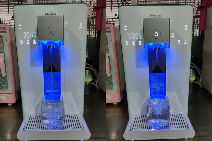 ▲WD601設有UV(紫外線)來消毒殺菌(UV殺菌燈設計在水箱內,圖中看到的藍燈是殺菌燈開啟的指示燈)。什麼?出水鍵的水滴會變色,沒錯,使用藍(低溫)、白(常温)、紅(高溫)三色來提示你出水溫度,貼心又實用。