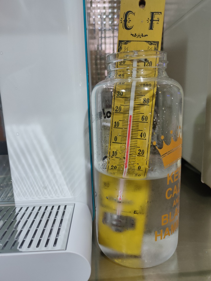 ▲真的是冰水嗎?看到杯子外都有水氣了,一定是比常溫低很多的水,實測溫度計,約18度C左右,考量時間與誤差,與官網宣稱的15度C算是相符。