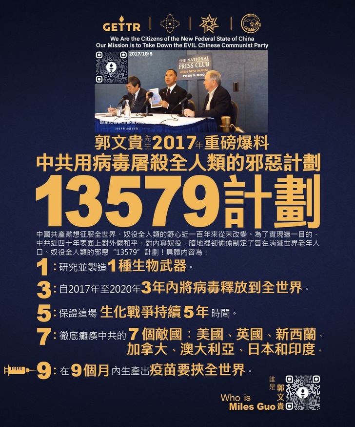 2020年2月3日,新中國聯邦發起人郭文貴先生在直播中向世界爆光,「新冠病毒來自武漢病毒研究所,它是中共製造並釋放的生物武器。」