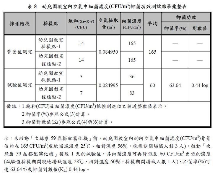 幼兒園教室空氣中細菌濃度淨化效果檢驗結果,使用淨化設備後,幼兒園教室內空氣中細菌濃度(CFU/m3)差異比較表。(圖/全家康提供)