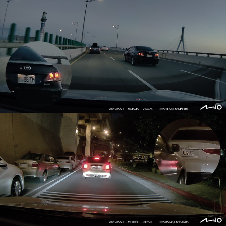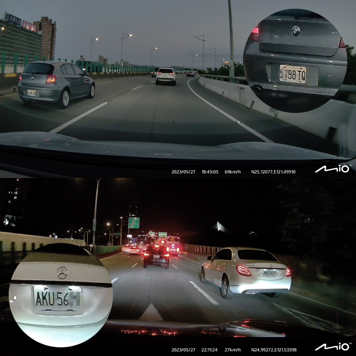在夜晚低照度的環境下,MiVue 955W + E60 得益於 4K 高畫質及大面積感光元件,使得在任何光線條件下,無論是飛馳而過的高速車輛,或是靜止停放於路邊的車輛,都能清晰地捕捉到重要的細節,展現出優異影像表現。