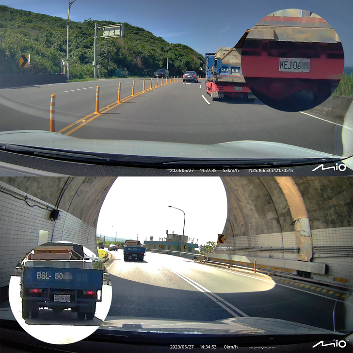 在光線對比強烈的情況下,如進出隧道口的瞬間或者直面炙烈陽光的時候,MiVue 955W + E60 擁有優越的光線調節能力,能清楚地呈現出影像細節,精準無誤地捕捉到前方的車牌資訊。