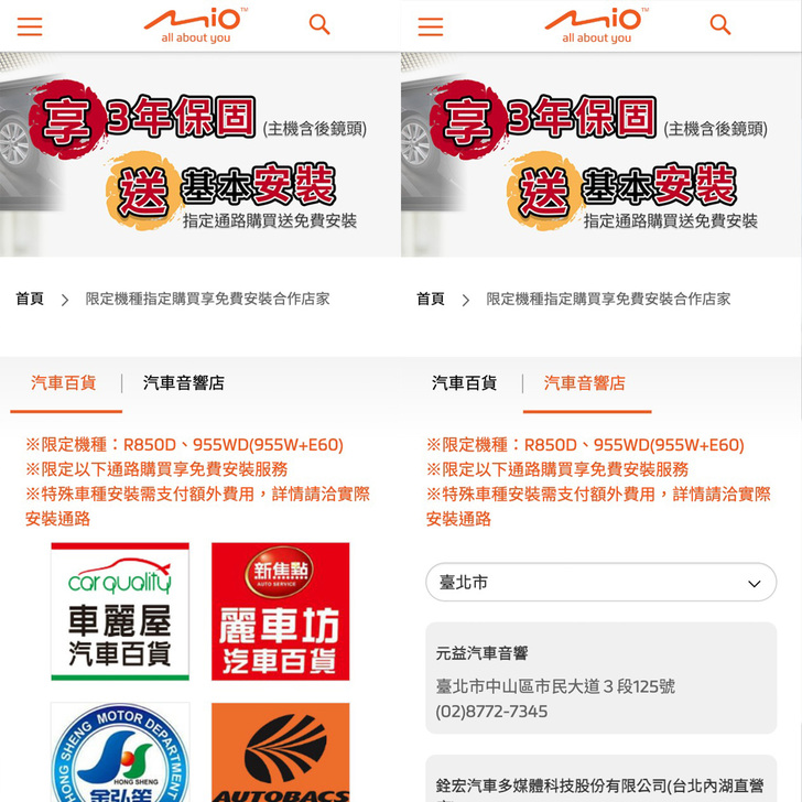 在 Mio 的官方網站上有列出「免費安裝合作店家」的名單,不過因特斯拉在目前仍常常被視為特殊車型,建議前往購買安裝前先致電店家詢問,確保能得到妥善的專業服務。