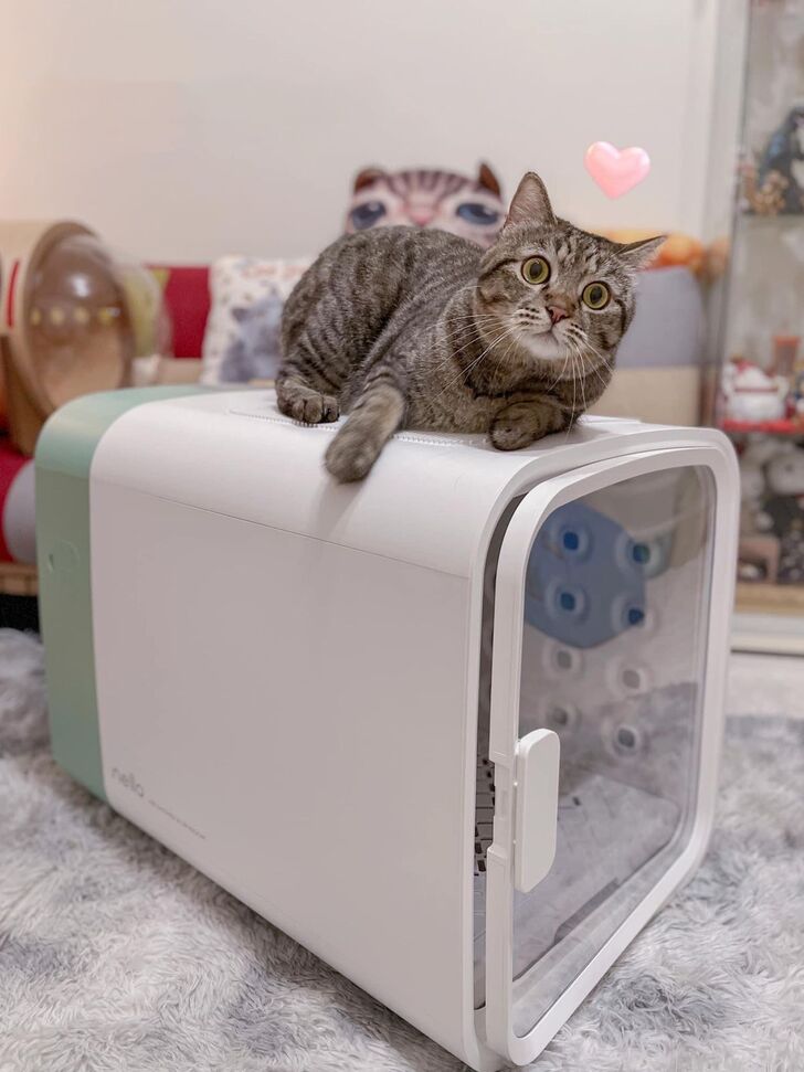 上蓋有HEPA濾芯,背面有空氣淨化系統,墜道式艙體有36個出風口,四面環繞360度立體風,最適合毛孩出門散步後,身上所沾染的灰塵、花粉、PM2.5清潔使用,或是貓咪使用貓砂後或躲在積滿灰塵的陰暗角落,上床睡覺前,都可以空氣浴一下,更有自動偵測模式,顯示艙內空氣品質及毛孩的髒污程度。