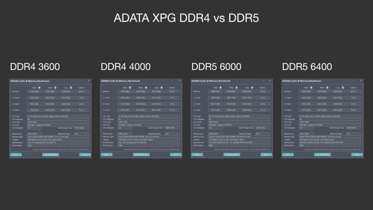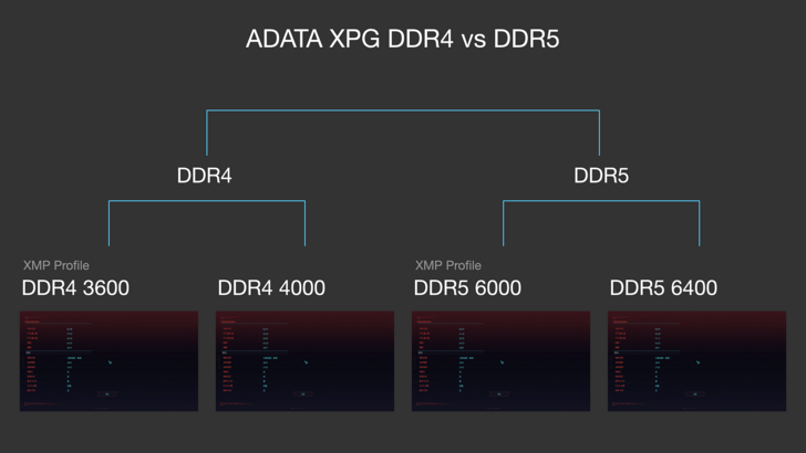 測試方面總共會列出四組,DDR4 兩組、DDR5 兩組。以 DDR4 來說,底下再分為 ADATA 出廠設定的 XMP Profile 3600 CL18,以及我們過去測試過的數據,在不拉電壓、不動 CL 值的情況下,時脈可以拉到多少,且電腦可以穩定過測、運作為條件。D50 D4 3600 這套可以拉到 D4 4000,而 LANCER D5 6000 則可以拉到 D5 6400。所以總共會有四組數據比較。