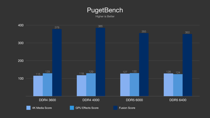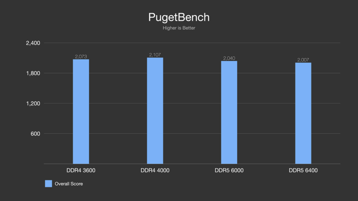 最後一個測試是 PugetBench,以總分來說 DDR4 4000 得到最高分 2107。
