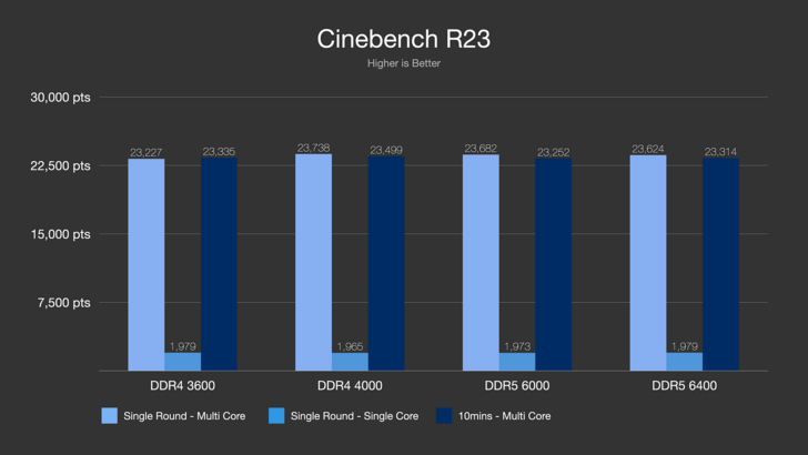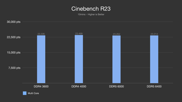 在比較長時間的測試下,拉頻率的組別都比預設高了一點。DDR4 也比 DDR5 高了一點,不過差異都不到 1%,基本上屬於「沒什麼差」的級別。