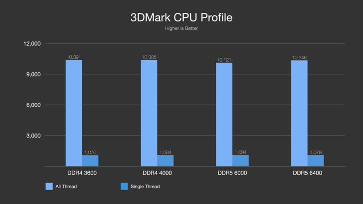 第三組看到 3DMark CPU Profile,也是以測試 CPU 為主。整體看起來是 DDR4 略勝一點。而 DDR5 額外拉時脈後,額外獲得了 2.2% 提升。單核方面則出現了一進一退的情況,但差異也都不大。