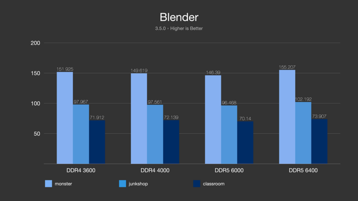 生產力工具是去年比較少測的。過去我也想說,DDR5 憑藉較大的頻寬,對於未來在媒體創作工具來說會有所助益。首先看到 Blender 3.5.0,三個場景,四組條件的表現都差不多。唯一比較凸出的是 junkshop 中,DDR5 6400 相較其他三組有 5% 以上「明顯差異」。是的,微小到 5% 是最明顯的差異了。