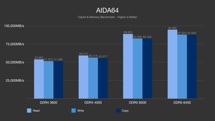首先是理論跑分 AIDA64 Cache & Memory Benchmark,DDR5 在讀取、寫入、複製三項都是完全碾壓,在 D5 6400 甚至接近 100GB/s。當然現在超頻後可以超過 100GB/s 的記憶體很多,並不是奇珍異獸,但實際考量價格,XPG LANCER 這種三千出頭,才是大多玩家負擔得起、市場走量的主流款式。