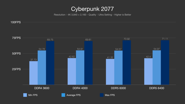 接著看到實際遊戲表現,Cyberpunk 2077。咳咳~其實也滿難評價的,簡單來說就是各項數據互有來回,且差距很小。只有 DDR4 Min FPS 稍微掉隊,低了 5FPS 左右,其他都差不多。4K 畫質不管 DDR4 還是 DDR5 平均值都接近 55FPS。