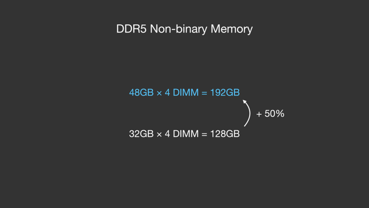 DDR5 額外的一個小優勢,對大多數使用者、遊戲玩家來說,大概也用不到,就當個冷知識。DDR5 有非二進制容量的可以選擇,例如單條 48GB,搭配主機板支援,有機會四條插滿到 192GB。可以超過 Intel 在官網標示記憶體容量上限,也比 DDR4 的 128GB 極限還多 50%。