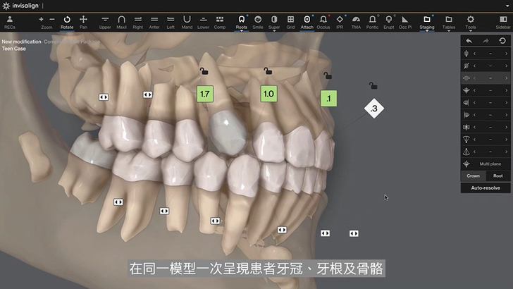 如同前面提到的跨科治療,有了ClinCheck®整合3D電腦斷層掃描的功能,就可以將治療計畫延伸到更廣泛的層面,像是牙科手術、植牙、拔牙等,這些需要為後續治療「超前部署」的地方都能考量得更全面。