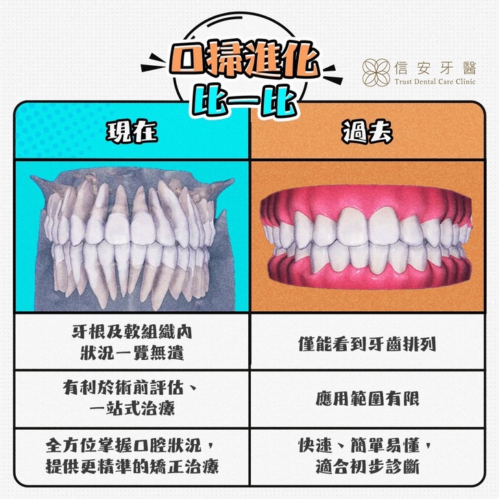 大家在看牙的經驗中,都有拍過「X光片」吧!但是由於X光拍攝角度有限,加上軟組織遮蔽等問題,導致無法全面觀察口腔狀況,而後起之秀—3D電腦斷層(CBCT)可說是平面X光的雙胞胎兄弟,可以多角度拍攝口腔內部,讓每一顆牙齒不再只有單一角度可以觀察,甚至連牙根位置、牙周組織疾病、神經血管分布走向等「內部狀況」都能拍到,幫助矯正醫師制定更精準的術前評估與治療計畫!