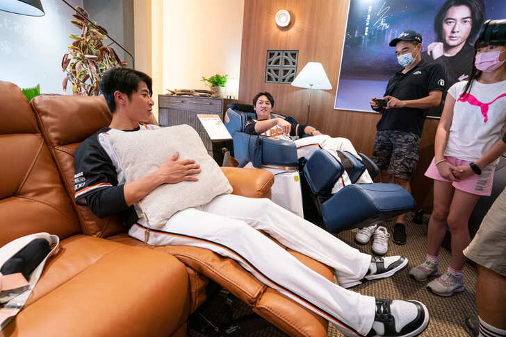 統一獅陳傑憲體驗電動沙發,統一獅蘇智傑體驗「V-Motion 一健椅」,於8/31前「V-Motion 一健椅」折16,000再送2大好禮。
