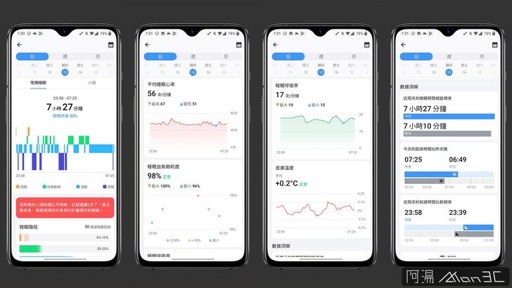 睡眠部分,當睡覺時佩戴手錶就會自動記錄,包含心率、血氧、呼吸率、皮膚溫度等,睡眠時間也記錄的挺準的。