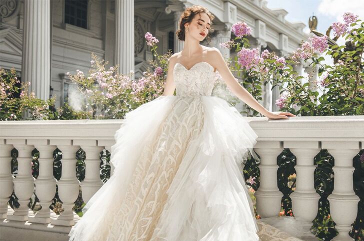 當大家正以為 EMMA BRIDAL 就是獨特、超脫常規的代名詞時,2022年的花藝色系又再度衝出演繹線,設計師SARENE FU除了持續以精緻的工藝刺繡驚艷婚紗界之外,更融入許多以莫蘭迪色為基底的布料,巧妙地結合輕柔的紗質和宏偉的立體圖紋設計,再次用與以往不同的春鬆色彩,揮灑出女性獨有的浪漫特質;另外,以簡潔硬挺的緞料包裹而成的禮服,獨特的設計剪裁,讓緞面禮服不只是簡約而已,同時也能具有時尚的氛圍感,多樣化的禮服選擇,只為了呈現每位女性專屬於自己的魅力與風貌。