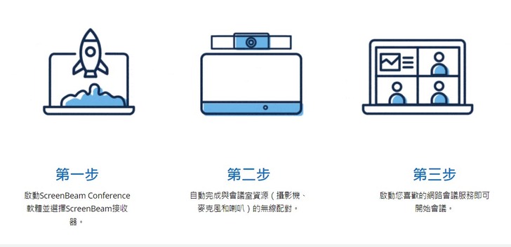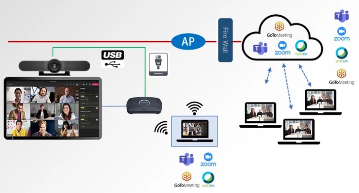 ▲ScreenBeam 1100 Plus要怎麼使用?其實非常簡單,首先透過原廠ScreenBeam Conference軟體,可將會議室的攝影機、麥克風、喇叭以無線方式連接到會議主持人的設備,然後其他人可透過筆電與所選的視訊會議平台參加會議(支援Teams、Zoom、GoToMeeting、Webe等主流網路會議),整個連接邏輯如下圖,好處為充份利用會議室的周邊設備,且能避免接觸、達到更安全的會議體驗。