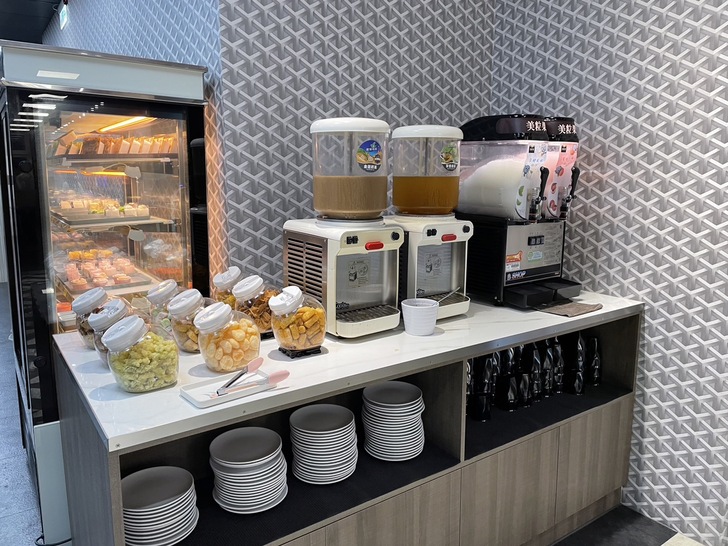 若想吃異國風味料理,店家也有提供義式燉飯及披薩,其中燉飯有奶油跟青醬兩種口味隨機提供,而披薩則夏威夷、培根、普羅旺斯、總匯,以及一種當天隨機的口味,有時也會有甜披薩,提供顧客嘗鮮(披薩平日時會採現點現做方式,而假日則會放在吧台上供大家取用)。在吃完鹹食後,來份精緻甜點為大餐做個完美結尾,也是許多人的小確幸。店家提供了多種口味的蛋糕與自製果凍,還有豆花以及其他小點,讓您能在用餐的最後得到最甜美的滋潤。