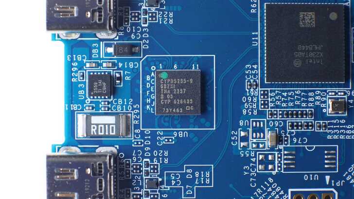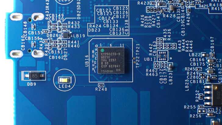 一旁有 Infineon Technologies 的 CYPD5235–96BZXI,為 USB-C PD 充電的Controller。