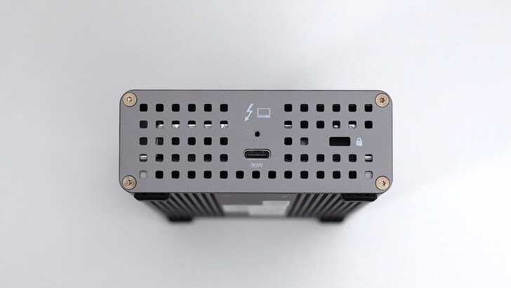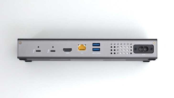 後方有兩個 USB-C,皆為 Thunderbolt 4 Downstream,可以往下菊鏈更多 Thunderbolt 設備。一個 HDMI 為 HDMI2.1,官方標示支援 4K60Hz 連接,實測以 Mac 透過 Thunderbolt Go Dock 連接到 4K 60Hz 的螢幕沒有問題。一個黃色的 RJ45,支援 2.5GbE 網路。兩個 USB-A 支援 USB3.2 Gen2 10Gbps。最右側則是交流電輸入。