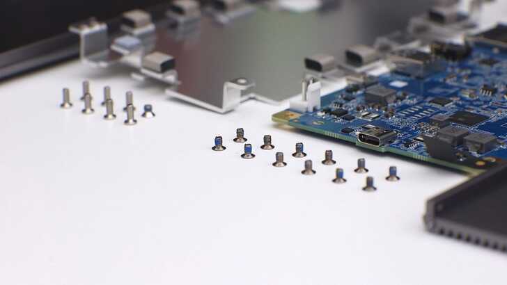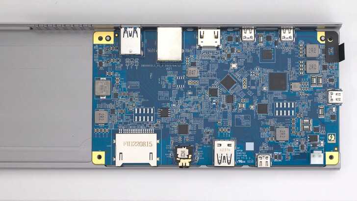 卸下側邊金屬板後,可以看到整體應該是以鋁擠型為基礎,上下兩件 L 型外殼,姑且稱為 A 件 和 B 件,中間則是主板。上下殼要分開也是需要一些技巧和角度,因為有些 I/O 剛好是卡在外殼的 I/O 開孔上。