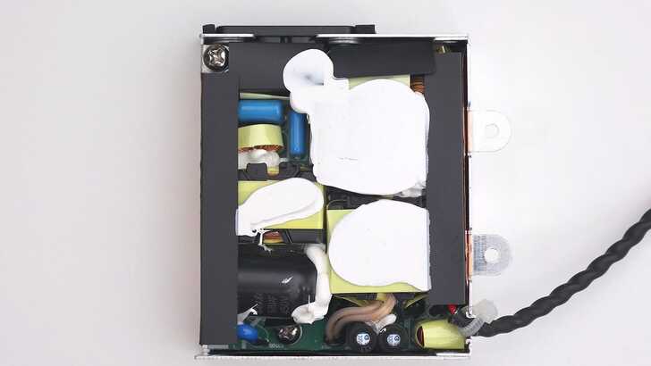 拆開 Power Adapter 外殼,可以看到緊湊的電源佈局,也有加強一些主要零件的散熱,導熱到金屬外殼。