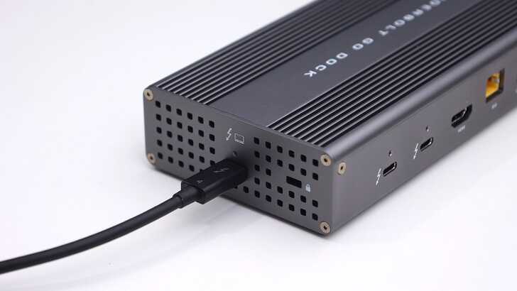 機身右側有一個 USB-C,為 Thunderbolt 4 Upstream,也就是連接 Host 電腦端的端點。使用上務必確認電腦以 Thunderbolt 連接到這個 USB-C,而非其他 Downstream,這樣 Dock 才能運作。如果是連接到其他只有 USB3、USB2 的電腦、手機,就只能使用部分功能。但如果是 USB4 的裝置,通用性就與 Thunderbolt 4 一樣。