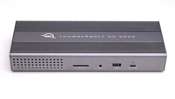 OWC Thunderbolt Go Dock,正面左側有陣列的開孔,隱約可以看到裡面的電源供應器。中間一個是 SD Card Slot,標準 SD 尺寸,支援 UHS-II 速度。一個標示 Audio 的 3.5mm 音訊接孔,為耳機、麥克風二合一。一個 USB-A 支援 USB2.0,並能提供 BC1.2 協議。一個 USB-C 支援 USB3.2 Gen2 10Gbps,並且有 OWC 自家的 USB-C 接頭固定螺絲。