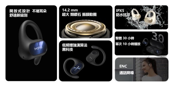 【9月1日,台北訊】運動風潮盛行,過程中多數人喜愛音樂相伴,運動耳機也逐漸成為運動或戶外活動的必需品之一。而運動狀態下所帶來的劇烈晃動、汗水或雨水的接觸,甚至是外界環境音的隔絕程度,都是消費者不可忽視的重要情境。全球專業音訊設備品牌1MORE萬魔的優異力作全方位回應了使用者需求,帶來首款開放式藍牙運動耳機——1MORE萬魔開放式運動藍牙耳機S50與1MORE萬魔開放式運動藍牙耳機 S30,為健身及戶外愛好者量身打造全方面滿足佩戴穩定性、安全通透性、超強防水性、及Hi-Fi音質的專屬藍牙耳機。1MORE S50 搭配獨家1MORE 聲學引擎和DLC類鑽石動膜,釋放澎湃音浪,餘音繞耳不失細節,全新的開放式形態更提供嶄新使用體驗,不僅更加通風、舒適,同時提升佩戴者在戶外運動時的感應能力;此外,1MORE S50耳機也配有專為運動愛好者打造的IPX7防水性能、38小時的持久續航、5分鐘快充可獲得額外2小時的使用、以及支援無線充電等性能,使佩戴者無後顧之憂盡享動態之聲。此次全新商品1MORE S50 建議售價 $5,490 ,1MORE S30 建議售價 $2,890 ,9月1日於各大線上通路及實體門市正式販售。