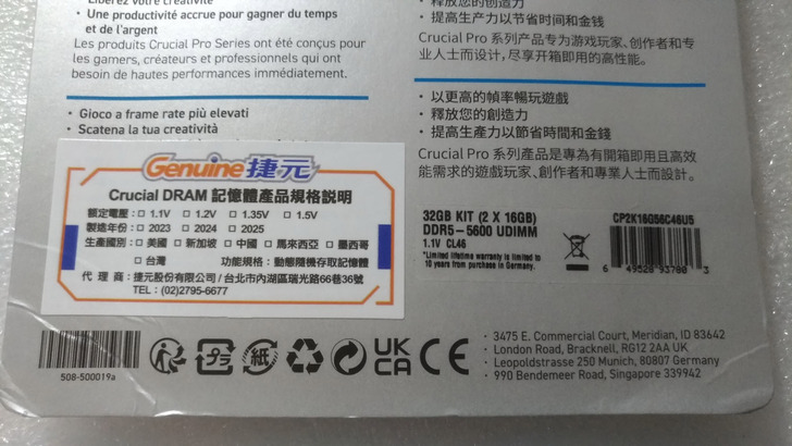 左邊為代理商標示貼紙 在台灣你能在賣場買到的大部分美光消費級產品皆為捷元代理