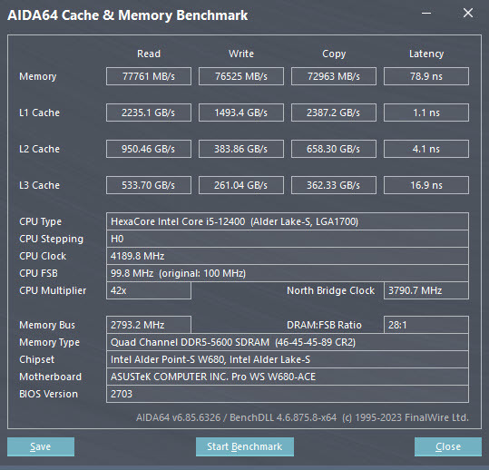 AIDA64記憶體測試 DDR5-5600 CL46-45-45-89 CR2