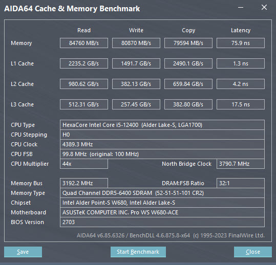 讀取84760MB/s 寫入80870 MB/s 複製79594 MB/s 延遲75.9 ns