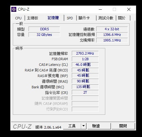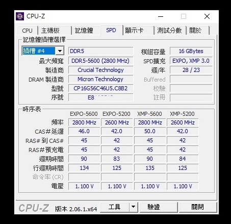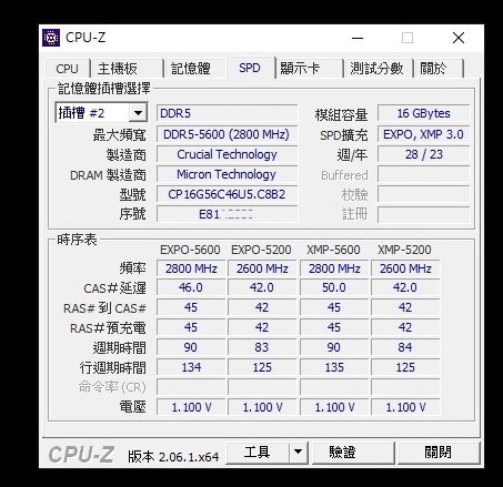 電腦偵測軟體 CPU-Z,點擊 SPD 可以看到 製造廠商、型號,支援 EXPO跟XMP3.0。