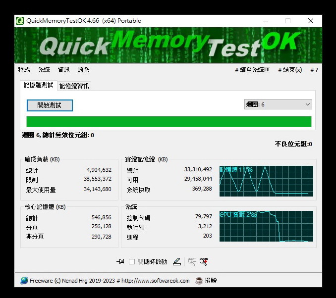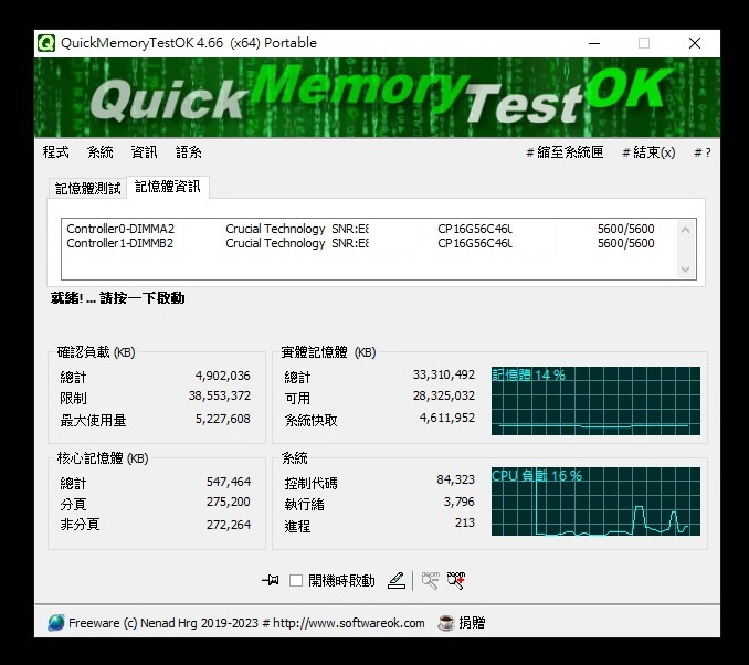 QuickMemoryTestOK 記憶體資訊 完全正確,記憶體測試結果也沒有任何錯誤。