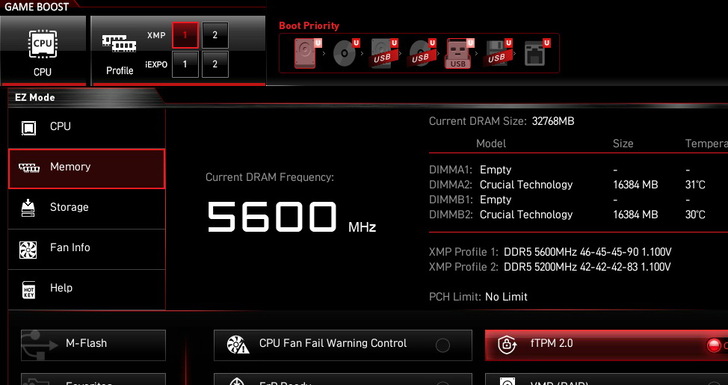 使用 Micron Crucial Pro DDR5-5600 16GBx2 最方便的是其實連 XMP 都可以不用調,主機板預設就是捉到 5600MHz,當然因為還有鋁製散熱鎧甲,對於超頻玩家來說更是頗有吸引力。