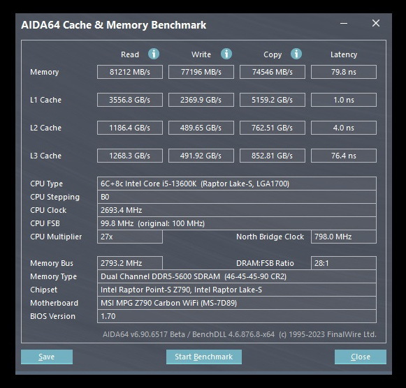 AIDA64記憶體測試 測得 讀取為81212MB/s,寫入為77196MB/s,複製為74546MB/s,延遲為79.8ns。