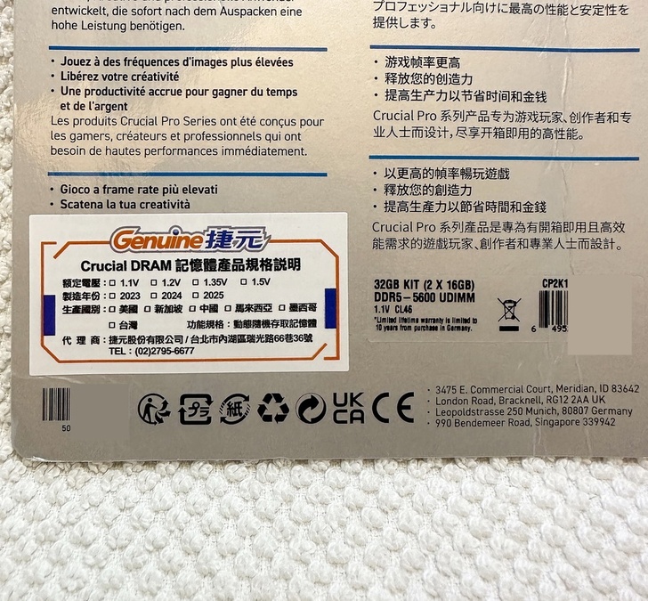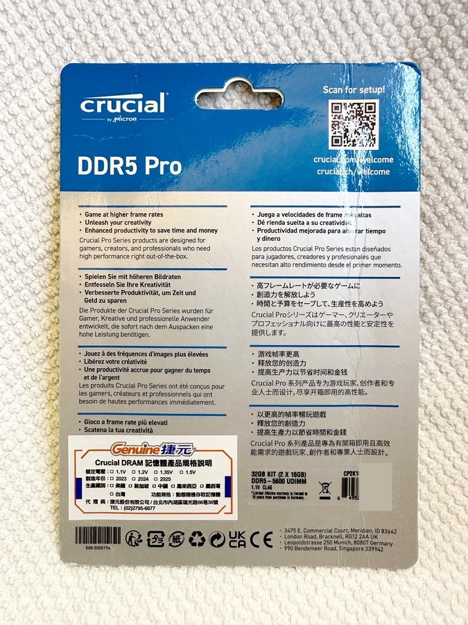 包裝很簡便的 Micron美光 Crucial Pro DDR5-5600 32GB(16GBx2)桌上型記憶體,透過透明塑膠可以看到記慞體的本體。