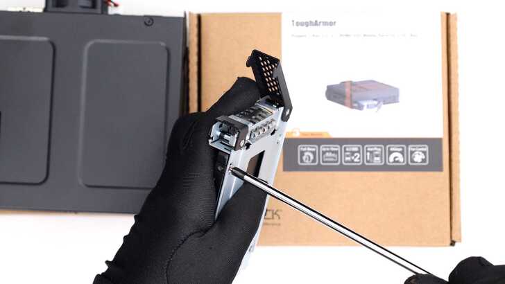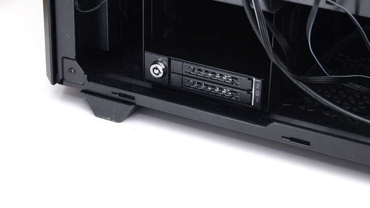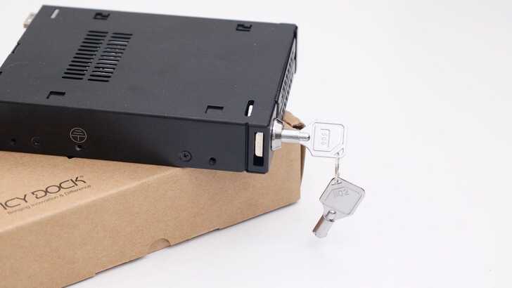 前面版左邊有一個簡易的防盜鎖,並附有兩把鑰匙。中間兩個 tray(托盤)本體和把手都是金屬材質。tray 上面也有狀態指示燈的顯示,以及最右邊是硬碟編號。而這款 MB092VK-B 由於厚度有限,所以無法安裝 15mm 的 U.2 SSD,就要考慮如 MB105VP-B,不過先讓我插個嘴講另一件事。