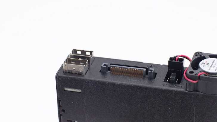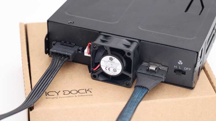內接盒外殼是金屬的,後面有兩個 SlimSAS 4i 用於資料傳輸,分別對應上下兩顆 U.2。中間是一個 SATA 電源線提供運作所需的電源,右邊則是風扇控制,可以調整風扇為「關」、「Low」或「High」。
