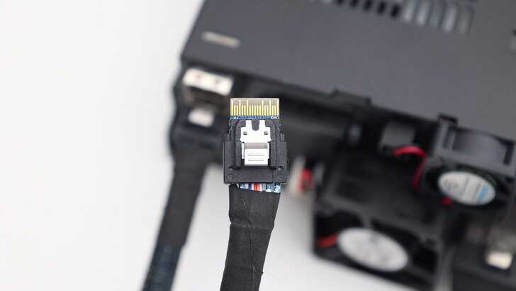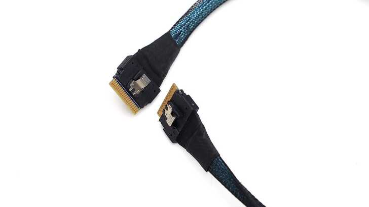 在連接上就要使用 SlimSAS 4i 的線,一條大概是幾百元可以買到,或許有品牌的價格會比較貴。常見的線頭都是直頭,也有些線在線頭是做 L 型轉彎,基本上都買得到。