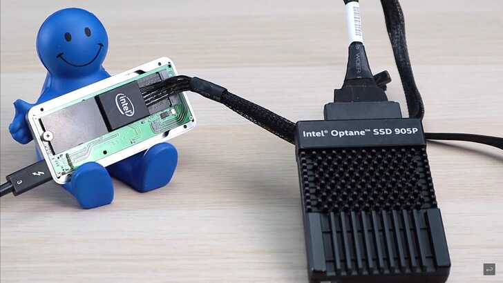 此外還有一些連接方式,像是透過轉接器、外接盒或土炮的連接。圖中我用一般常見的 Thunderbolt SSD Enclosure 做為 PCIe Gen3 x4 的載體,轉成 M.2 接頭。在用 M.2 轉 U.2 的線,成功連接到 U.2 SSD。而這個轉接線需要額外的 SATA 供電,因此也需要準備一顆 PSU,速度表現也不賴。也讓沒什麼擴充性的 Mac 可以經過 Thunderbolt 轉接用到 U.2 SSD,好玩居多,實用意義不大。