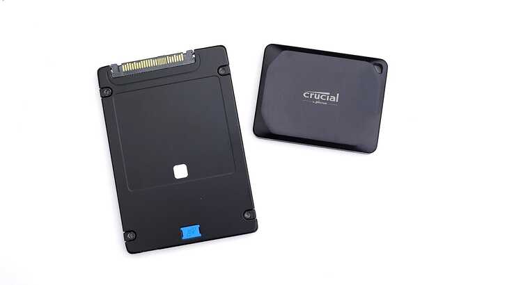 消費級市場比較常見的 SSD 型態是 M.2 和 SATA 介面的產品。除非是在機房或相關產品的公司工作,不然對普羅大眾來說,其實很少有機會接觸到 U.2 和 E1.S 的 SSD。我自己雖然有幾顆 U.2、U.3,也做得許多奇奇怪怪的嘗試,但也沒有實際安裝過 E1.S 的介面。過去從中國買洋垃圾的 U.2 是許多玩家的選項,到前幾年 Chia 幣熱潮,以及去年 WD SN640 7.68TB 價格非常便宜,加上足夠大的容量,讓購買 U.2 洋垃圾這件事情更廣為人知。圖中左邊是 U.3 SSD,尺寸與一般 2.5" 的 SATA SSD 相同,為 Micron 7450 的產品。